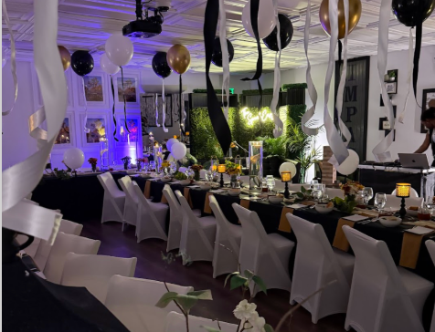 A fully dressed venue with balloon installations, candlelit tables, and ambient lighting ready for your party, dinner, or celebration.